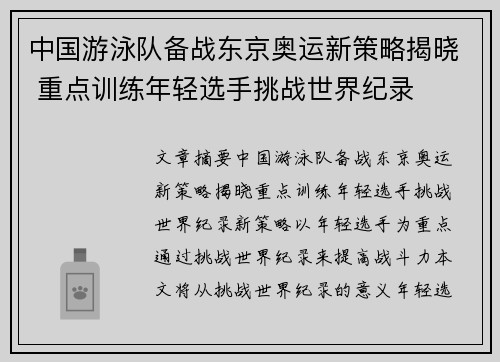 在东京奥运会的赛场上,中国游泳队凭借出色的表现和不懈的努力,刷新了多项纪录,力争为祖国赢得更多的金牌荣耀。本篇文章将围绕中国游泳队在东京奥运会中的亮眼表现进行详细阐述,内容从四个方面进行分析。首先,我们将探讨中国游泳队的整体实力和优秀的备战计划。其次,分析东京奥运期间,中国游泳队在各个项目中刷新的多...